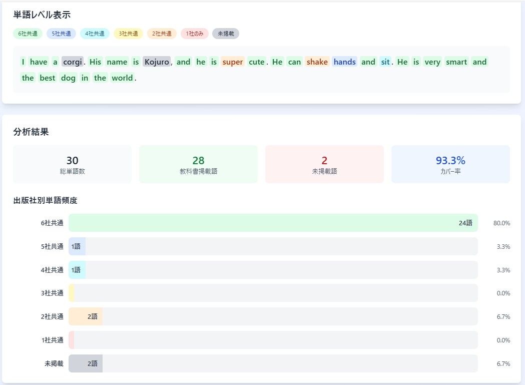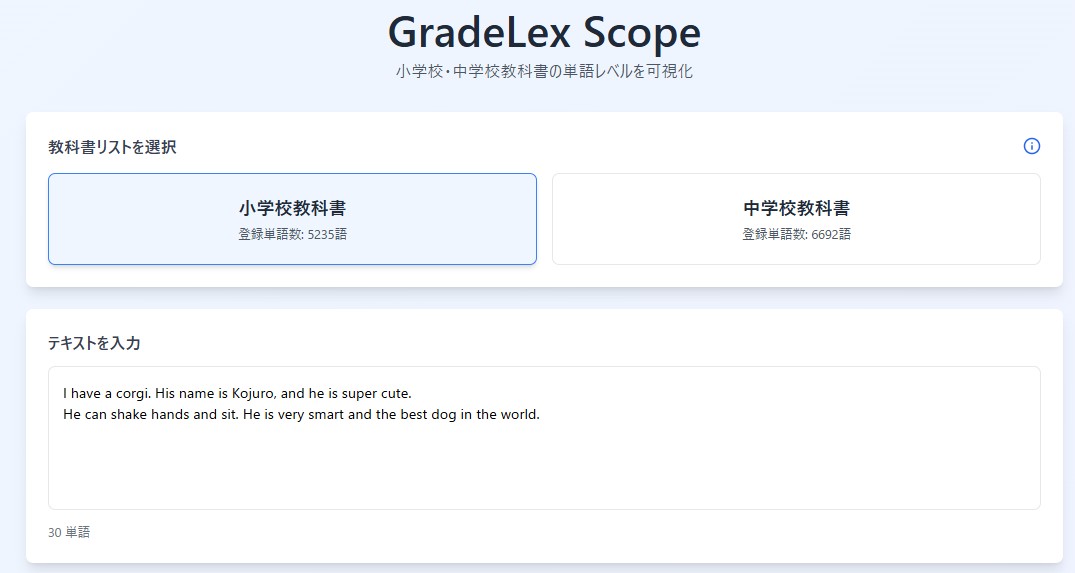 英文をテキストボックスに貼り付けると,小・中学校の使用教科書数を自動分析するウェブアプリです。