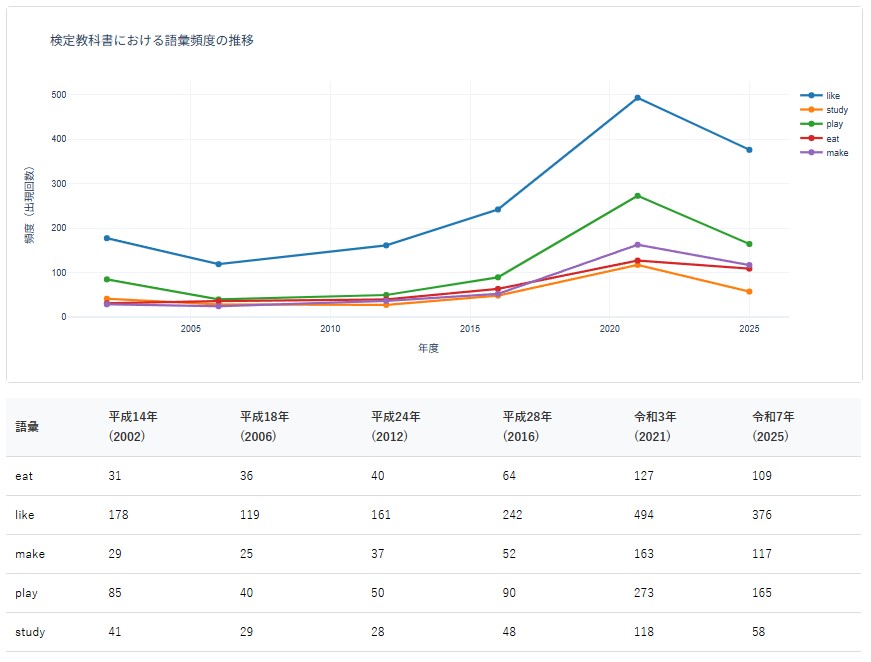 カンマ(,)で区切って単語入力すると,平成14年度版〜令和7年度版中学校英語教科書における語彙の出現頻度を表示します。例えばlike,study,play,eat,makeを入力した場合以下のような結果を返します: