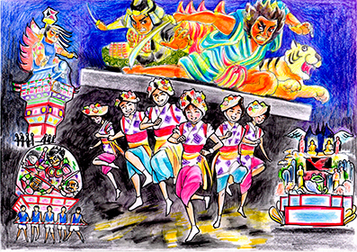 青森森県版小学校英語読み聞かせ教材です。10のトピックをそれぞれ1枚絵で表し、ターゲットとなる表現もスクリプトとして書き表し、文字のインプットができるようになっています。絵には多くの情報を盛り込んでおり、教員は読み聞かせに加え、児童と豊かなインタラクション(small talk)も行うことができます。 |